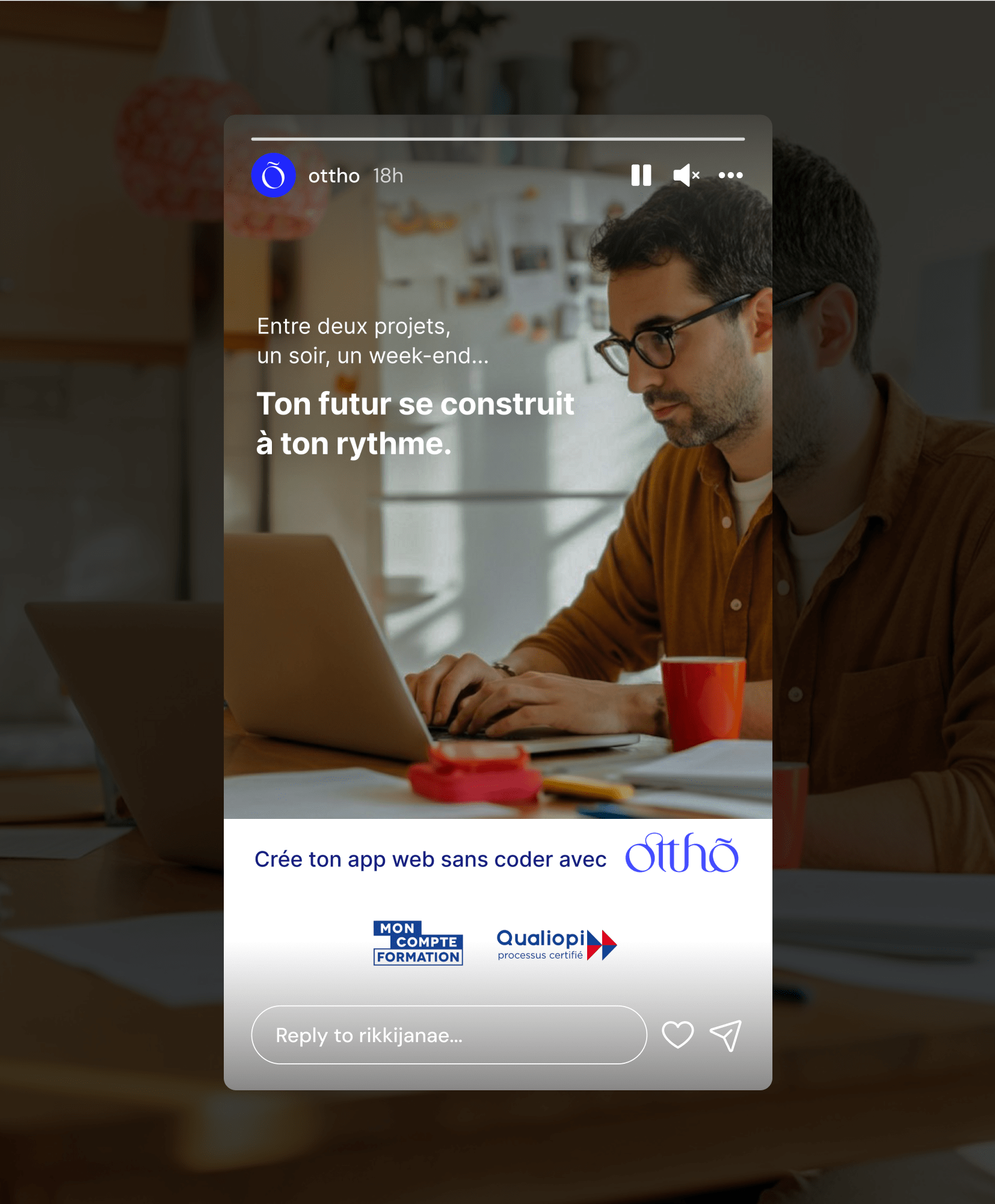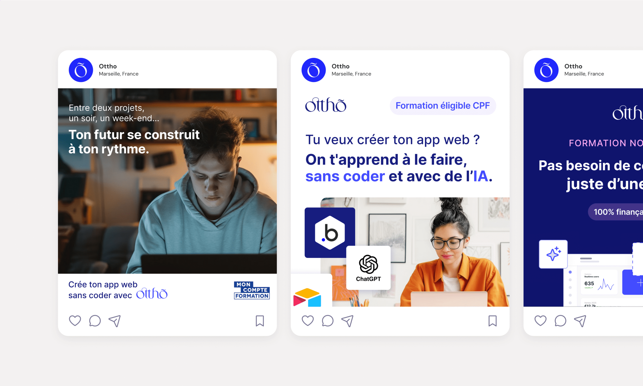En parallèle, une série de contenus publicitaires Meta a été développée pour particuliers et professionnels, avec un design dynamique et pédagogique, afin de clarifier le No Code et renforcer l’impact de l’univers Ottho sur les réseaux sociaux.