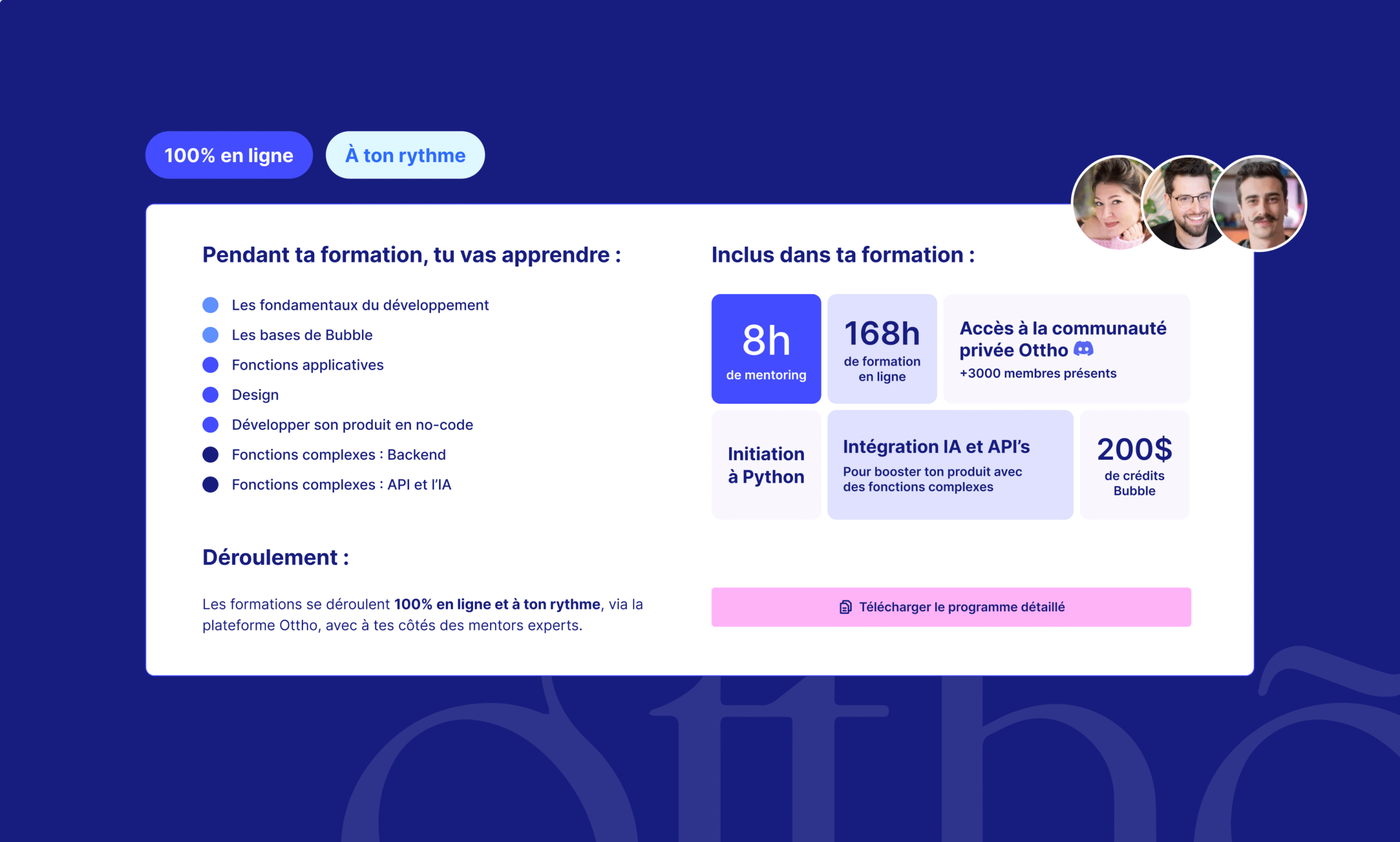 Depuis sa création, Ottho s’est imposé comme une référence dans la formation aux outils No Code. En formant plus de 3 000 apprenants à des solutions comme Bubble ou Make, la plateforme contribue à rendre le no-code accessibles à particuliers, indépendants ou professionnels.